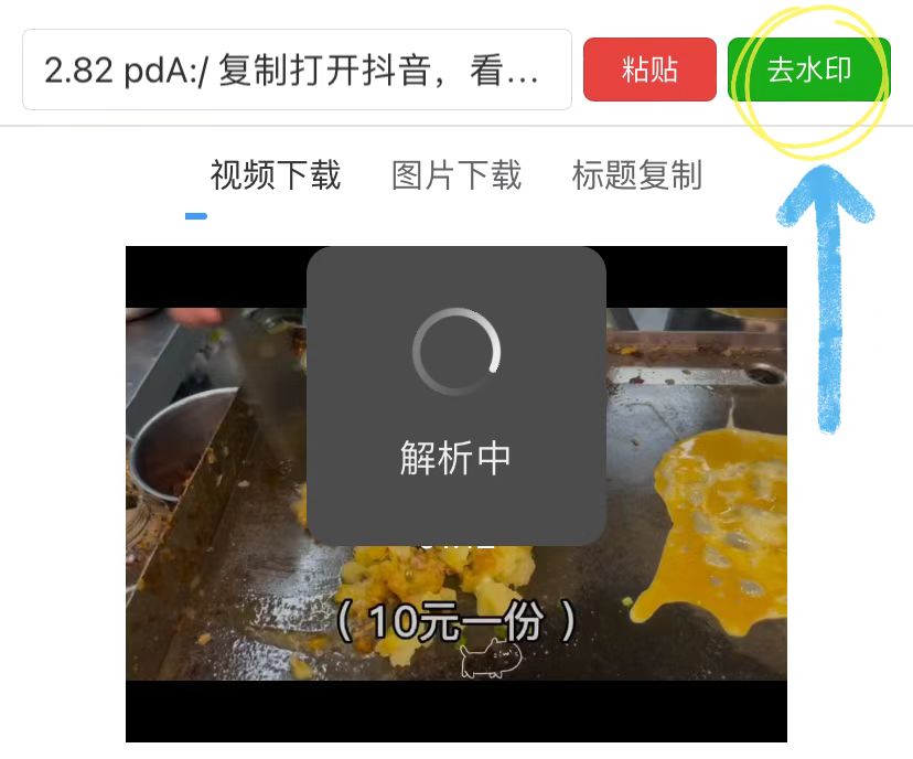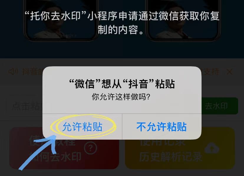 微信小程序搜索”托你去水印“,打开小程序,点击红色”粘贴“按钮粘贴上一步复制的链接。如下图: