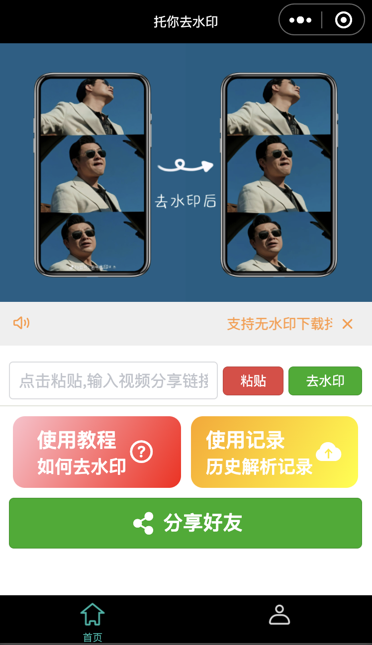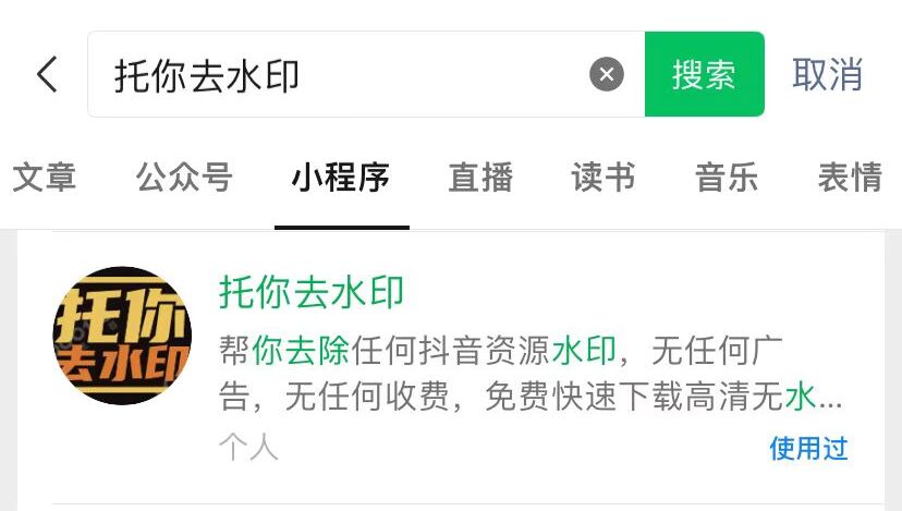 所以我自己做了个微信小程序 ”托你去水印“ ,来下载无水印的抖音视频或者图文,现在也是免费提供给大家使用,也无广告。